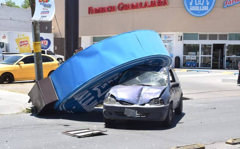 Chihuahua.- Debido a las fuertes ráfagas de viento, cayó un espectacular, sobre un automóvil chevy tripulado por una mujer quien sufrió unos golpes tras el impacto y fue trasladada a un hospital.